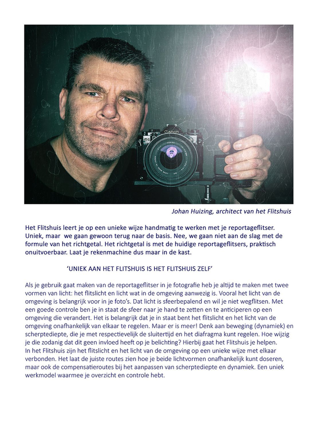 Dit boek neemt je mee langs alle kamers van het Flitshuis en geen deur zit op slot. Je gaat leren om handmatig te werken met je reportageflitser. Nee, het is geen boek met rekensommen met de formule van het richtgetal. Dat richtgetal ligt op zolder in een stoffige verhuisdoos. Die gaan we niet gebruiken. Het Flitshuis heeft een andere methode om tot een correcte belichting te komen van flitslicht en het licht van de omgeving. Want laten we het licht van de omgeving niet vergeten. Dit licht is misschien nog wel belangrijker dan het flitslicht zelf. Licht van de omgeving is sfeerbepalend en wil je niet wegflitsen. In het Flitshuis zijn het flitslicht en het licht van de omgeving op een unieke wijze met elkaar verbonden. Het laat de routes zien hoe je beide lichtvormen onafhankelijk kunt doseren, maar ook de compensatieroutes bij het aanpassen van scherptediepte en dynamiek. Een uniek werkmodel waarmee je overzicht en grip houdt.